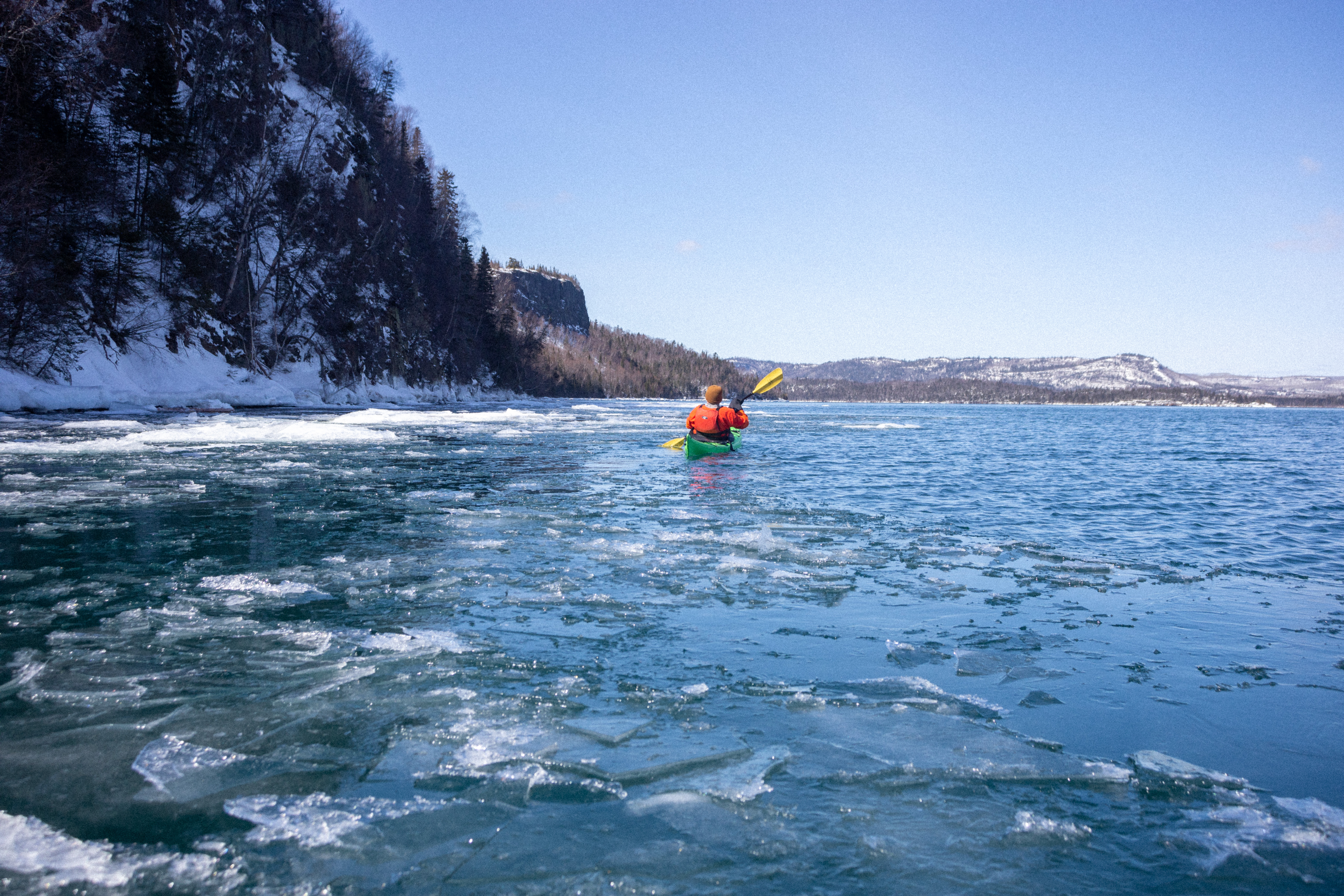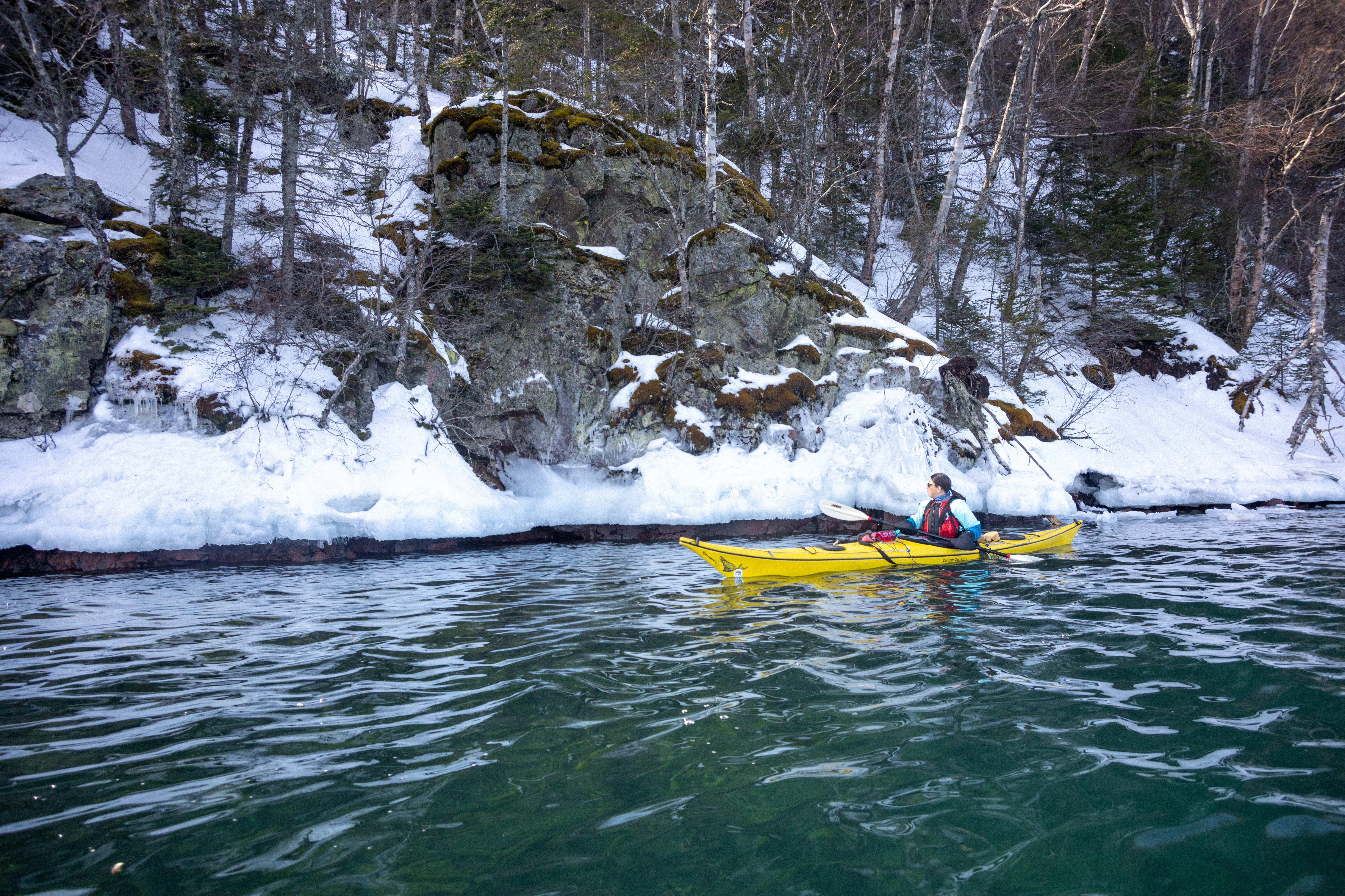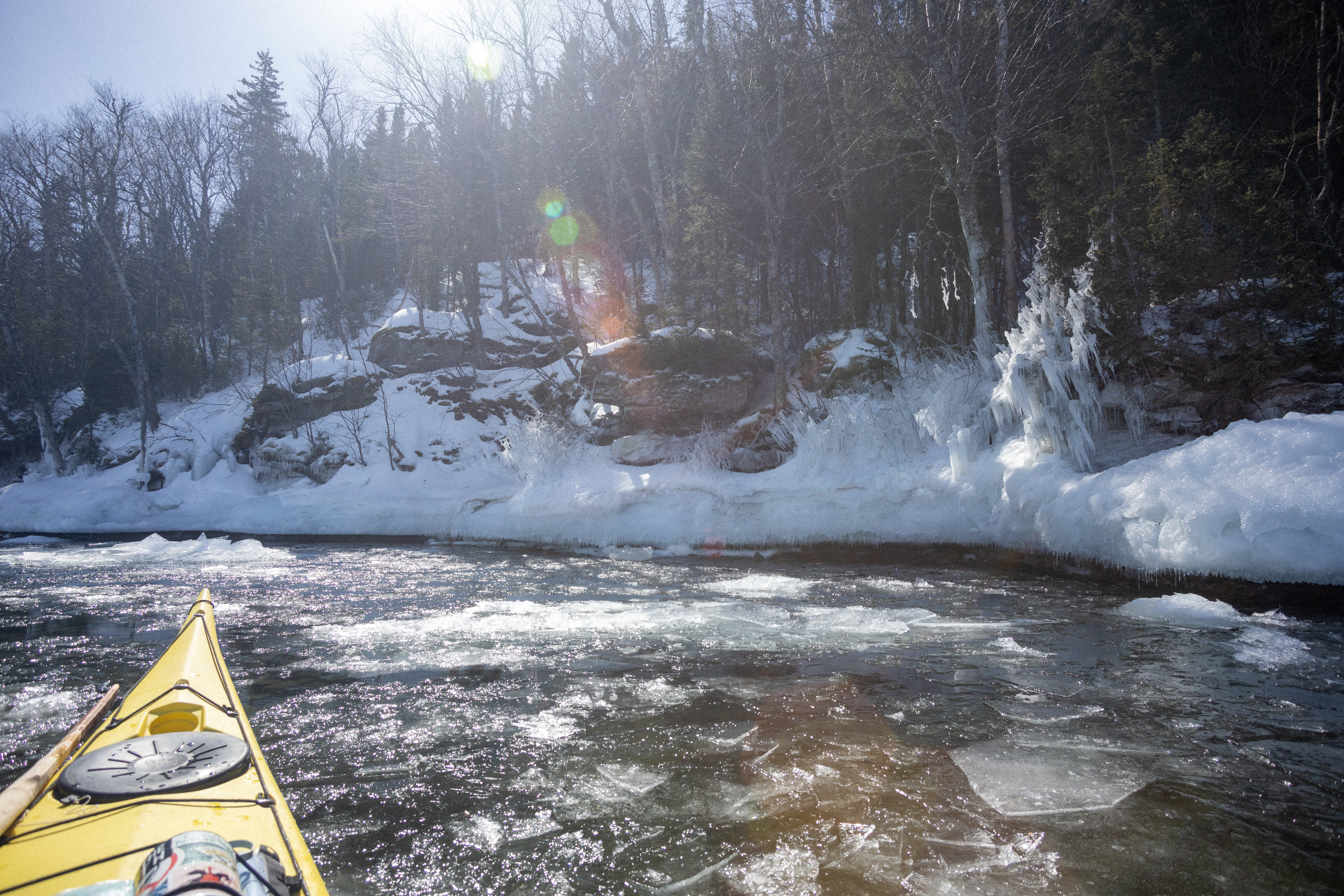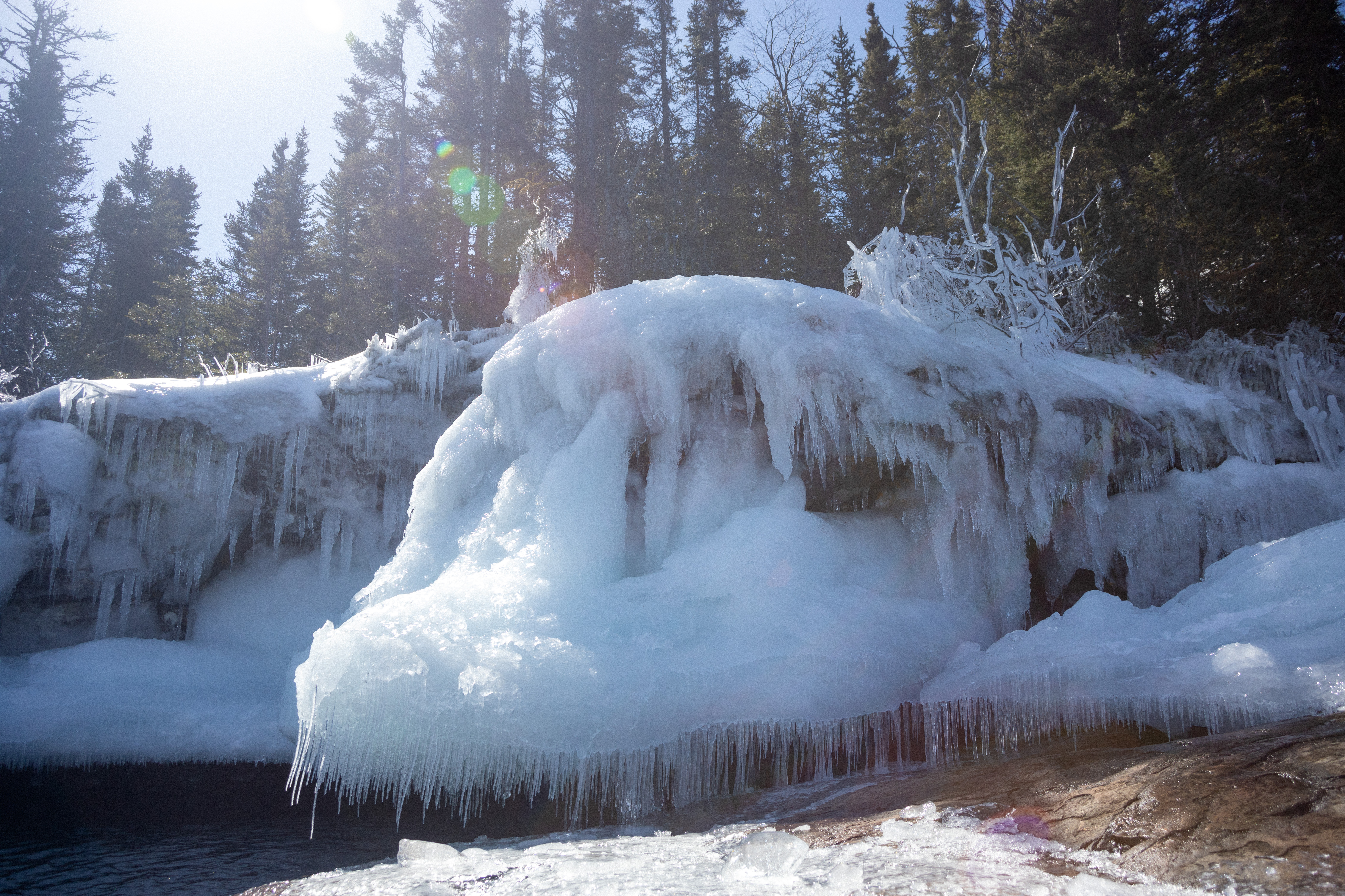 Smashing our way through some thin overnight ice to get across the bay.A recent winter storm drenched the shoreline in waves, creating some spectacular ice formations. Getting a little bumpy out there…